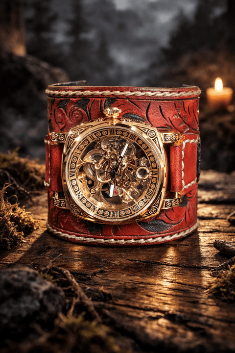 Bracelet-Montre Steampunk en Cuir Rouge Foncé – Modèle “Couronne du Temps