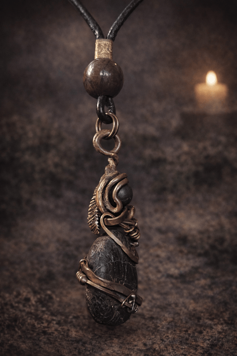 Pendentif talisman artisanal avec pierre sombre et ligatures métalliques | Atelier AnJo