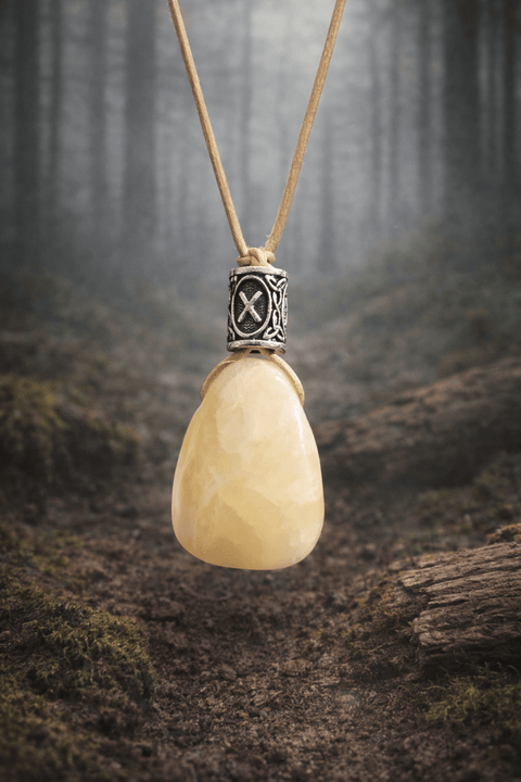 Pendentif en calcite naturelle – bijou artisanal en acier inoxydable, Tir na Telennaria
